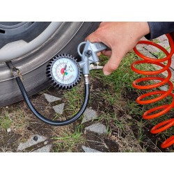 Komplettes Zubehörset für Kompressoren mit Schnellkupplungssystem. Es besteht aus einer Manometerpistole zum Aufblasen (max. 12 bar), einer Blaspistole mit kurzer Tülle und einem flexiblen/dehnbaren Schlauch (5 Meter).