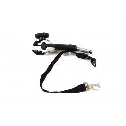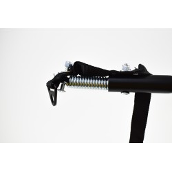 This adapter is an alternative way of attaching a trailer to a bicycle in cases where the rear wheel axle is too long or does not protrude, making it impossible to fit the conventional hitch on the axle. The part with the spring inserts into the trailer drawbar (spring diameter 21mm), while the clamp attaches to the frame (diameter 15 to 35 mm). Take care not to pinch the brake cable or other moving parts when fitting. Compatible with STORAG trailers. Always attach the trailer’s safety strap to the bike.