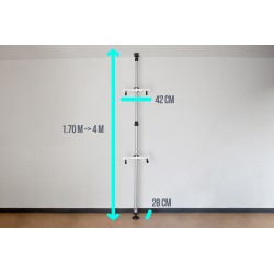Telescopic storage rack for 2 bicycles weighing up to 30 kg. Assembles in just a few minutes, and can be adapted to ceiling heights from 170 to 400 cm. Height-adjustable support arms rotate 360° and hooks are adjustable. Space-saving!