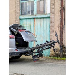KIT E-Scorpion extension +1... à partir de €149.90 Quick view Adapter strap extension kit... à partir de €39.90 Quick view The E Scorpion PRO is undoubtedly the best offer on the market today for a foldable bike rack specially designed to transport electric bikes (even the largest) but it is also the best product for all heavy and large bikes. Easy to use, it is ultra compact once folded.No need to wear it, you can roll it thanks to its integrated wheels. Solid and quick-to-use towing ball attachment system, user-friendly functions such as front wheel anti-swing system, wider mounting frame, easy tipping, wheels for transport, steel locking cable and loading ramp! Technical specifications MAX number of bikes: 2Towing ball: yesSwan neck/ detachable ball: yesWeight: 21.5kgMAX loading: 60kgMax weight per bike: 30kgDimensions (width x depth): 134 x 70cmFolded dimension: /Inclination: yesAnti-corrosion protection: yesPin type: 13 pinWheel support max: 139.3 cm in 29'Max tire width: Anti-theft on the hitch ball: yesAnti-theft for bicycles: yes ATTENTION, on some vehicles equipped with vertical rear doors (utility type), you may have to turn or protect your handlebars to avoid possible contact with the vehicle.Does not allow the tailgate to be opened for van-type vehicles. (VW transporter, Citroën berlingot, Peugeot partner, Renault master,...)