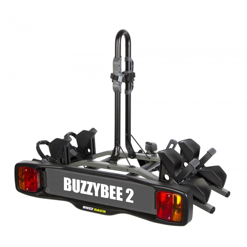 Nuestro nuevo BUZZYBEE 2 se adapta a todo tipo de bolas de enganche de 50 mm (regular y cuello de cisne). Puede transportar hasta 2 bicicletas, adultos o niños. La plataforma está equipada con luces traseras y un soporte de matrícula. Las bicicletas se sujetan con correas de sujeción.