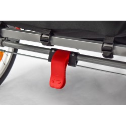 Se entrega con un sistema de enganche estándar que se fija a los cierres rápidos de las ruedas de la bicicleta.