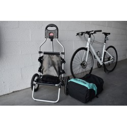 Caddie tracté Storag, vous pouvez utiliser le sac séparément, le caddie pour vos courses ou l'accrocher à l'arrière du vélo. Sac en nylon résistant à l'eau, chassis en aluminium léger et roue 12''. Pensez à vérifier la compatibilité avec les dimensions de votre vélo.