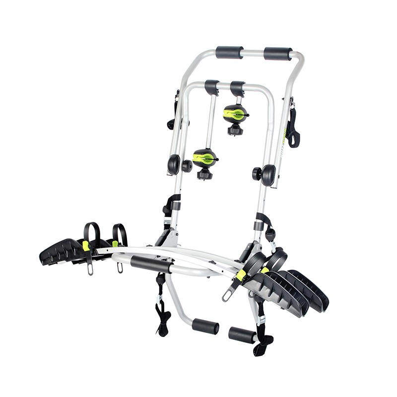 De PILOT, een fietsendrager in platformstijl die op de meeste auto's past zonder dat een sleepsysteem nodig is. Er passen 2 fietsen op zonder dat ze bewegen of elkaar raken, waardoor krassen op de fietsen worden voorkomen.